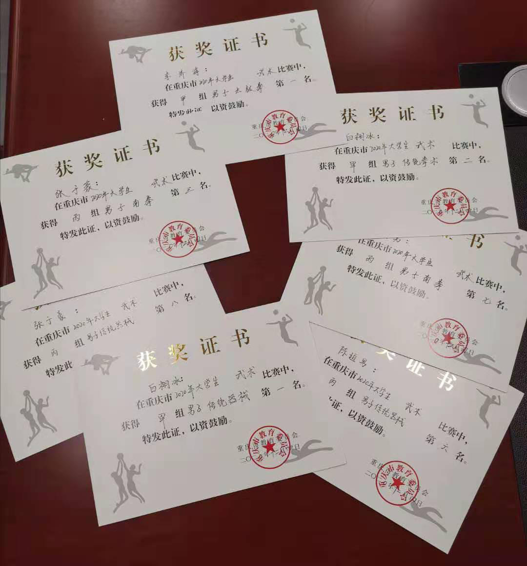 在焦急等待了十天后,重庆市大学生武术比赛成绩于12月3日中午12时许发布于重庆市大学生体育协会官网。我校武术代表队获得个人项目男子甲组太极拳第一名、男子甲组传统器械第一名、男子甲组传统拳术第二名、男子丙组南拳第三名、第七名,男子丙组传统器械第六名、第八名的好成绩。参赛的所有项目全部进入前八名,并获得四项前三名的佳绩。虽然时间紧,参赛人数少,但我校代表队仍然取得了辉煌战绩。取得如此成绩与学校和色情直播各部门的大力支持,技术顾问李少丹的指导,教练王方的辛苦付出以及队员们的奋力拼搏密不可分。