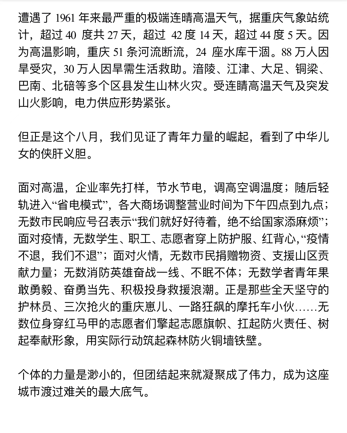 本次活动主要围绕近期所发生的自然灾害及新冠疫情让大家聊聊自己的想法与心情。今年是自然灾害最多的一年,先是受持续高温困扰;接踵而至的是多处地方发生火灾,在灼热窒息的高温之下,面对严峻的山火,消防官兵以勇敢无畏的姿态,与慑人的火舌面对面对峙,守护了我们的家园;9月四川省泸定发生,消防队立即对受灾地区展开搜救工作,即使再艰险的环境也没有挡住他们救援的脚步。今年重庆成都疫情再度来袭,家家户户连夜排队做核酸,每个人都在为战胜疫情而贡献自己的一份力量!
