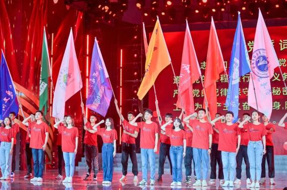 的同学表现积极,随叫随到,朝气蓬勃。排练现场从早到晚都能看见他们的身影,校旗、党旗、国旗。于不同节目中来回切换,节目后台是他们奔跑的身影。在《向党宣誓 青春告白》环节中,15所高校的学生党员代表,面对鲜红的党旗庄严举起右手,重温入党誓词时其背后所代表的的学校校旗,能够看见他们举旗的挺拔身影,展现了体院学子青春向上、坚持不懈的风貌。